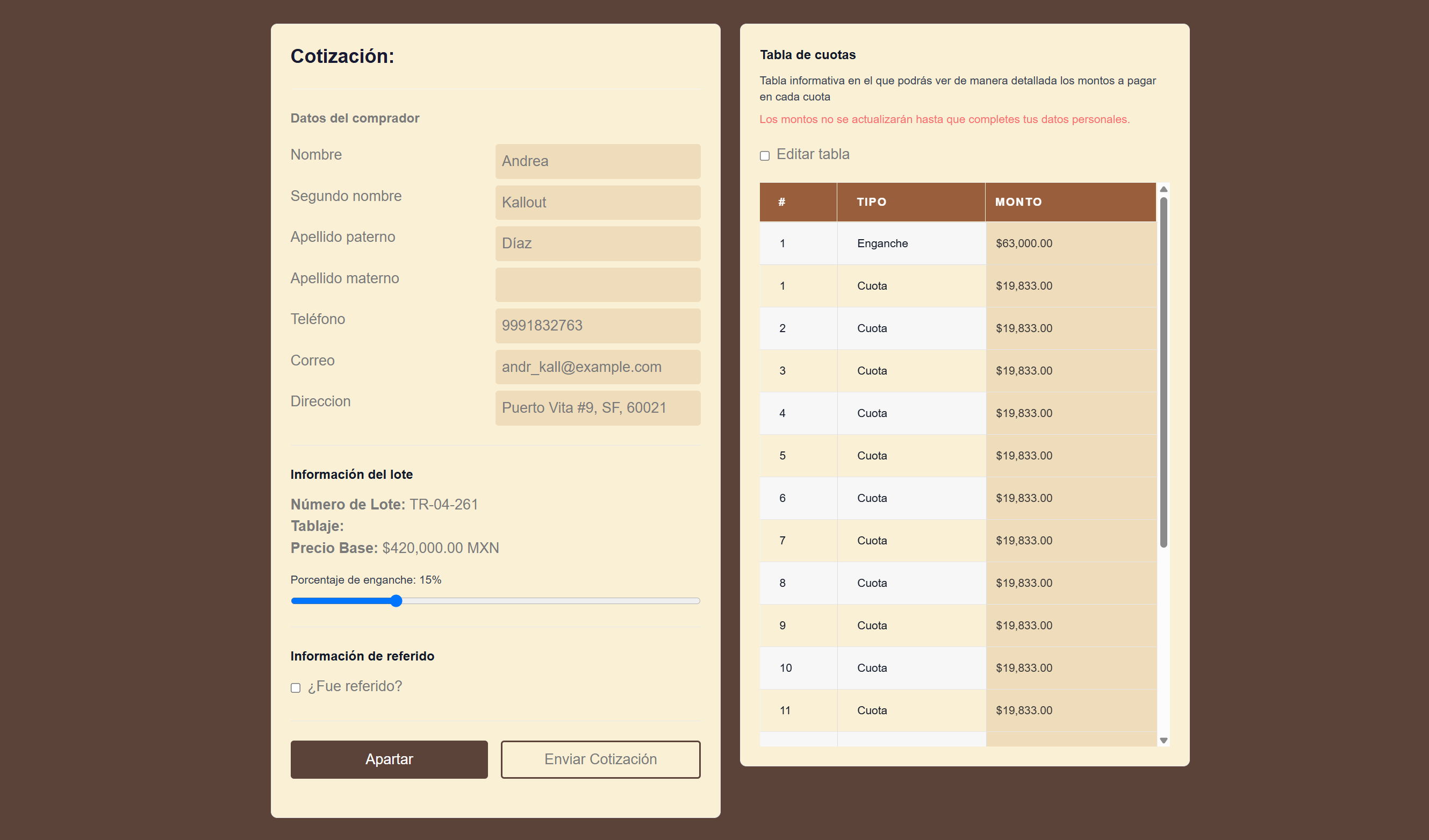 Se habilita una nueva sección en la web oficial de Tres Raíces que permite a clientes finales cotizar y comprar un lote de forma autónoma.- Cotizador dinámico con simulador financiero (enganche y plazo configurables).