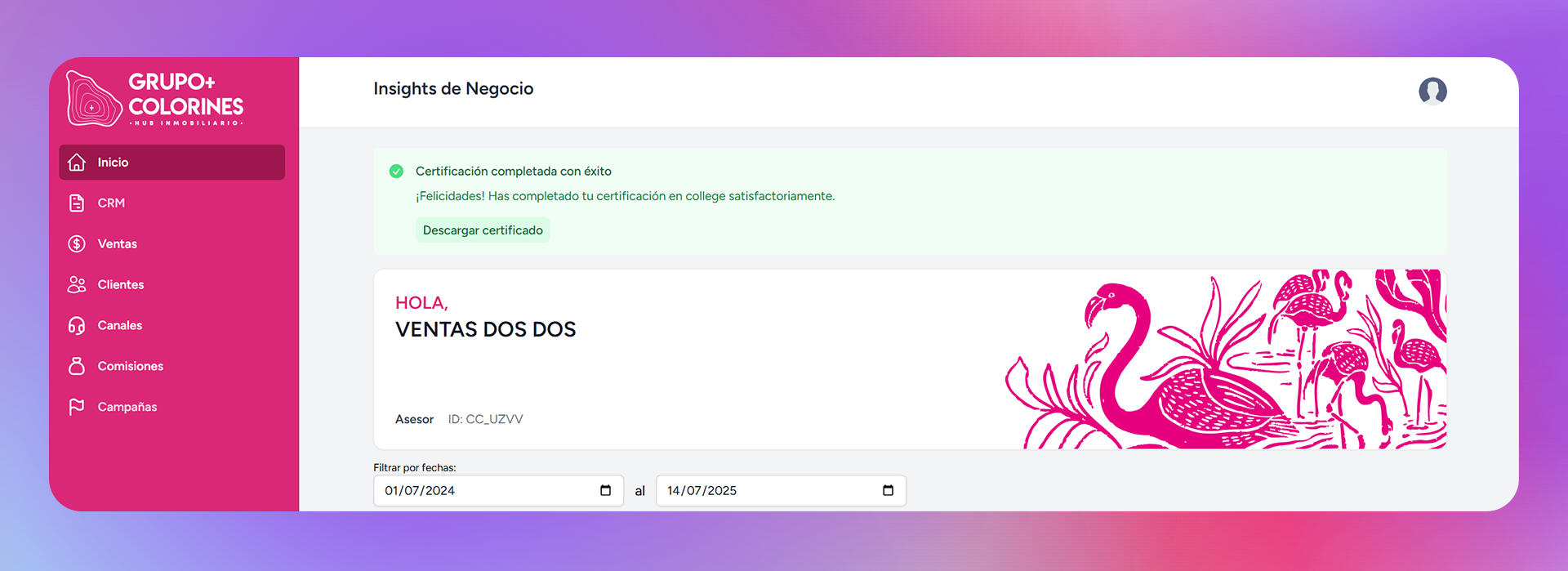 Al acceder al módulo de Inicio en el Dashboard, si el asesor ha completado su proceso formativo en College, se despliega un mensaje destacado en color verde.Este mensaje, habilita un botón de descarga directa del certificado en formato PDF, lo cual facilita su disponibilidad para trámites o validaciones internas sin necesidad de solicitarlo a Éxito al cliente.Características principales