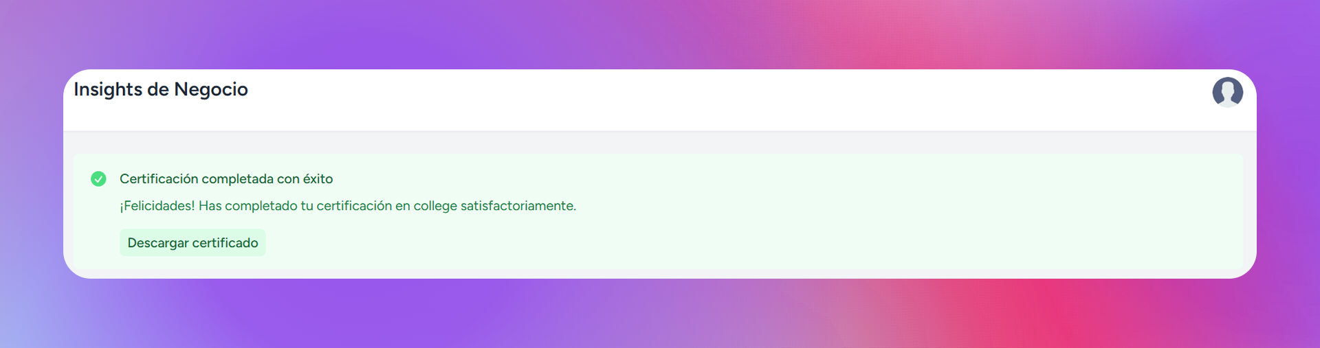 Elemento que muestra un mensaje destacado en la parte superior del Dashboard e incluyendo un botón para descargar el certificado oficial de finalización de College.¿Para qué sirve?