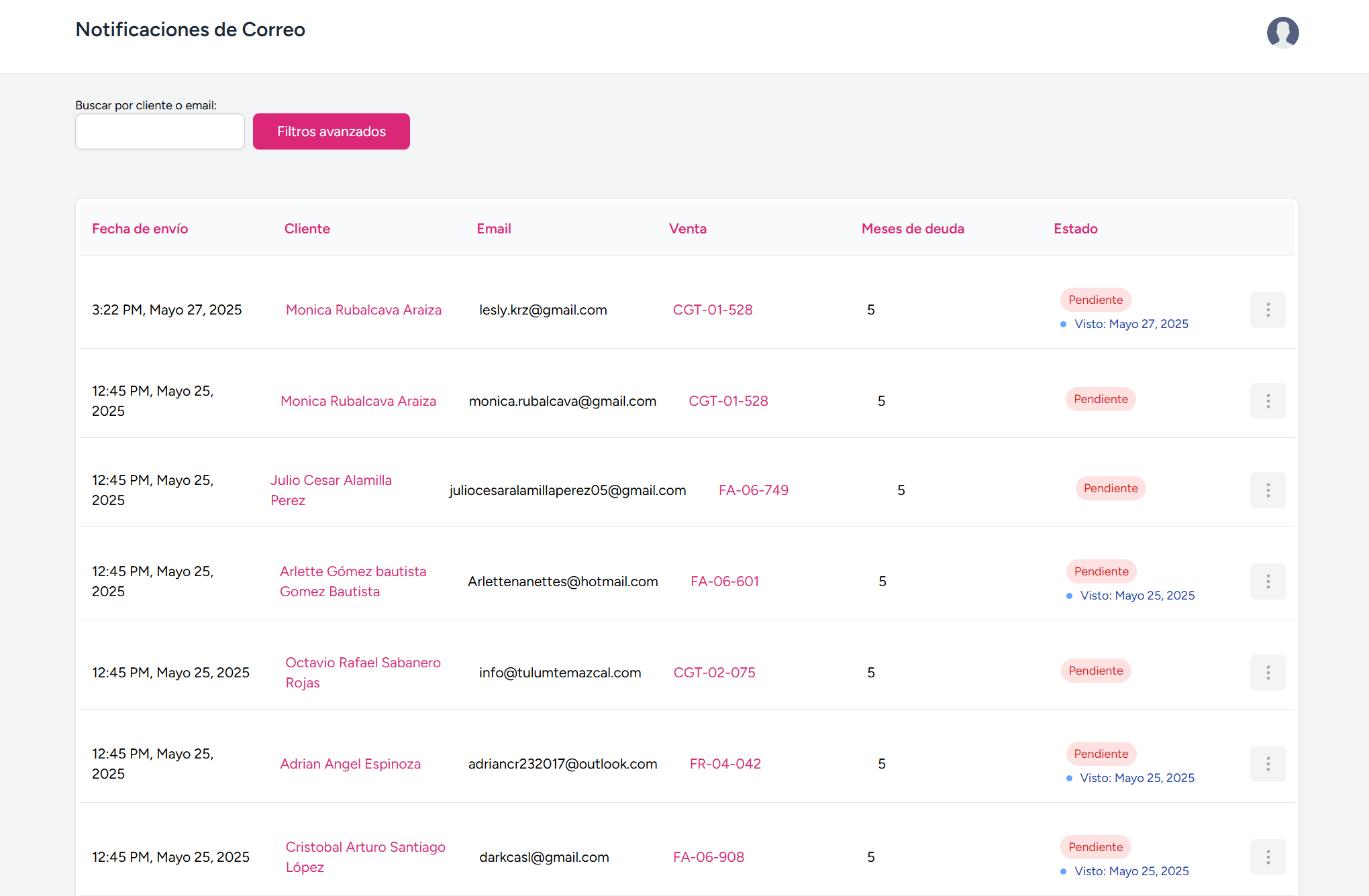 Anteriormente el envío de estas notificaciones se realizaba de forma manual, lo que generaba omisiones y falta de seguimiento. Este nuevo sistema automatiza el proceso y asegura el cumplimiento legal del procedimiento.Descarga de reportes de venta / Asesores - feature