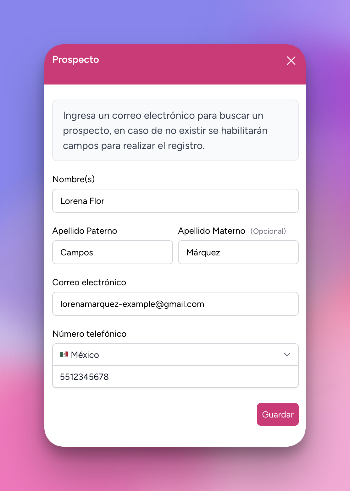 Al hacer clic en el ícono para agregar prospecto, se abrirá un panel lateral. Llena los siguientes campos: