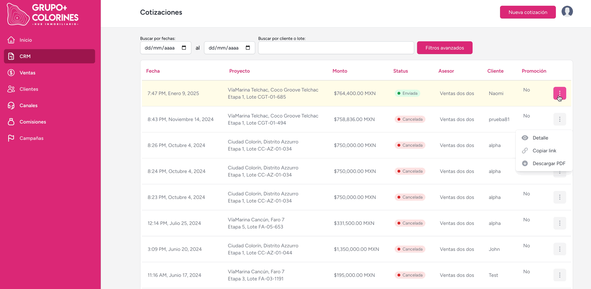 Desde la tabla de cotizaciones, identifica la cotización que deseas cancelar.Haz clic en los tres puntos verticales al final de la fila y selecciona “Cancelar cotización”.